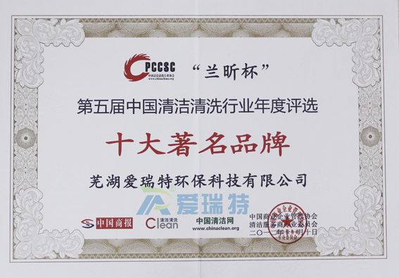 金秋颯爽,碩果累累,由中國商報、中國清潔網(wǎng)、中國商業(yè)企業(yè)管理協(xié)會、清潔服務商專業(yè)委員會舉行的“蘭昕懷”第五屆中國清潔清洗行業(yè)年度評選活動中,蕪湖愛瑞特環(huán)??萍加邢薰颈辉u為“十大著名品.